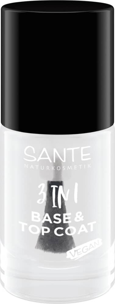 Базовое и верхнее покрытие Sante 3 в 1 является веганским продуктом и сочетает в себе преимущества базового покрытия, верхнего покрытия и средства для укрепления ногтей в одном изделии.