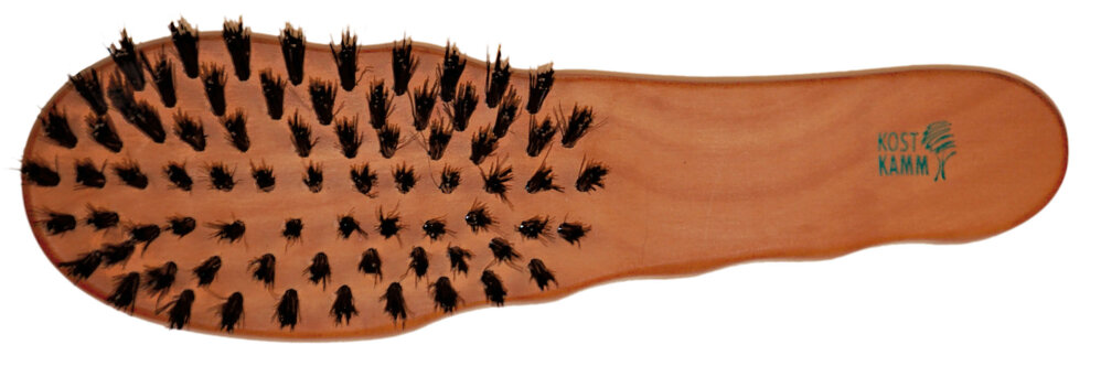 Щетина кабана первого среза, 7 рядов, длина 19,5 см. Жесткая щетина подходит практически для всех типов волос – интенсивный массаж кожи головы – хорошее сцепление как с короткими, так и с длинными волосами.