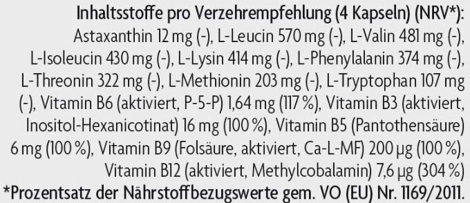 Дополнен натуральным астаксантином. Витамины В3, В6, В12 и В9 (фолат) в активированной форме. Аминокислоты, полученные в результате естественной ферментации растительного сырья.