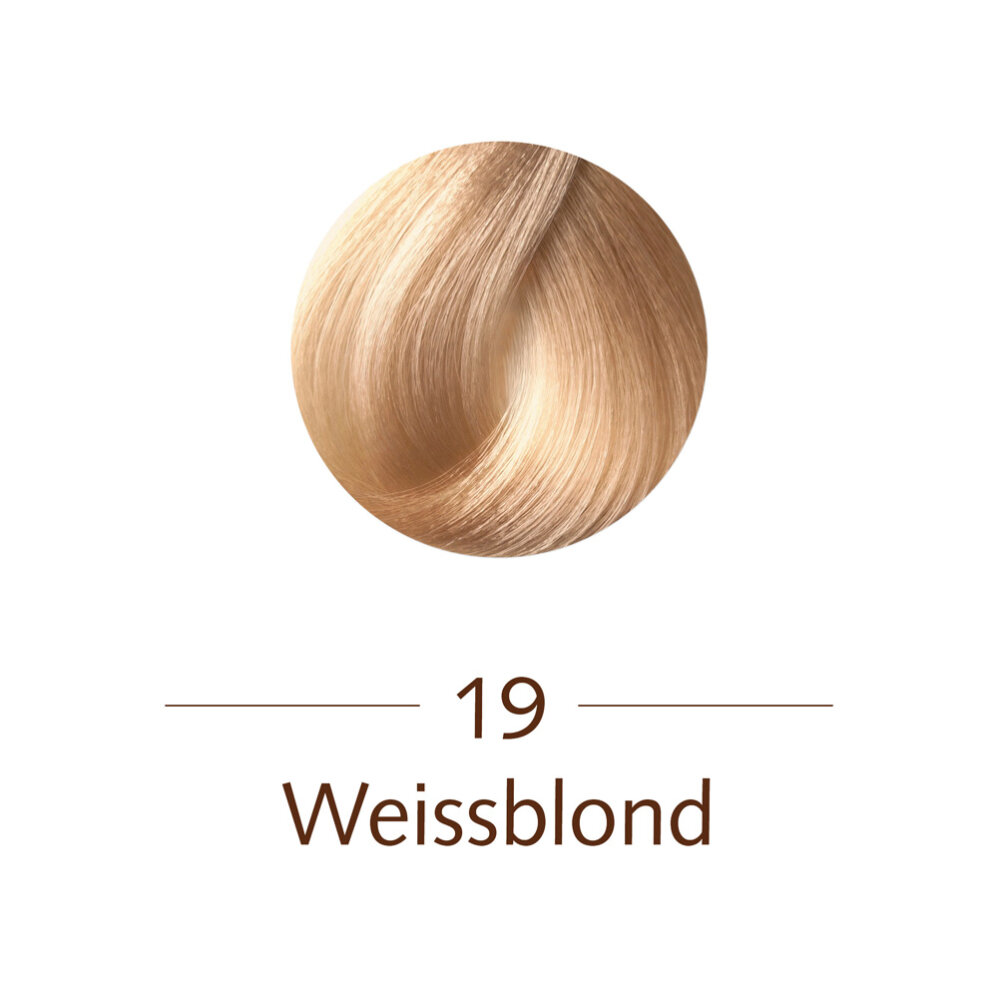 Farbpaste (Tube) 19 Weissblond:, Aqua, Cetearyl Alcohol, Ethanolamine, Polysorbate 80, Ceteareth-30, Sodium Lauryl Sulfate, Isopropyl Stearate, Propylene Glycol, Tetrasodium EDTA, Parfum, Ascorbic Acid, Sodium Hydrosulfite, Panicum Miliaceum Extract, Calcium Pantothenate, Biotin, Vitis Vinifera Leaf Extract, Olea Europaea Leaf Extract, Betula Alba Bark Extract, Urtica Dioica Leaf/Stem Juice, Limonene, Benzyl Alcohol, Benzyl Salicylate, Amyl Cinnamal, p-Aminophenol, p-Phenylenediamine, 4-Chlororesorcinol Fixiermittel (Flasche):, Aqua, Hydrogen Peroxide, Stearyl Alcohol, Cetearyl Ethylhexanoate, Ceteareth-50, Phosphoric Acid, Phenoxyethanol, Tetrasodium EDTA, Sodium Gluceptate, Disodium Pyrophosphate Revitalisierungsbalsam:, Aqua, Cetearyl Alcohol, Cetrimonium Chloride, Panicum Miliaceum Extract, Laurdimonium Hydroxypropyl Hydrolyzed Wheat Protein, Isopropyl Stearate, Calcium Pantothenate, Biotin, Citric Acid, Parfum, Phenoxyethanol, Benzyl Alcohol, Isoeugenol, Geraniol, Limonene, Benzyl Salicylate, Eugenol, Hydroxycitronellal, Linalool, Alpha-Isomethyl Ionone