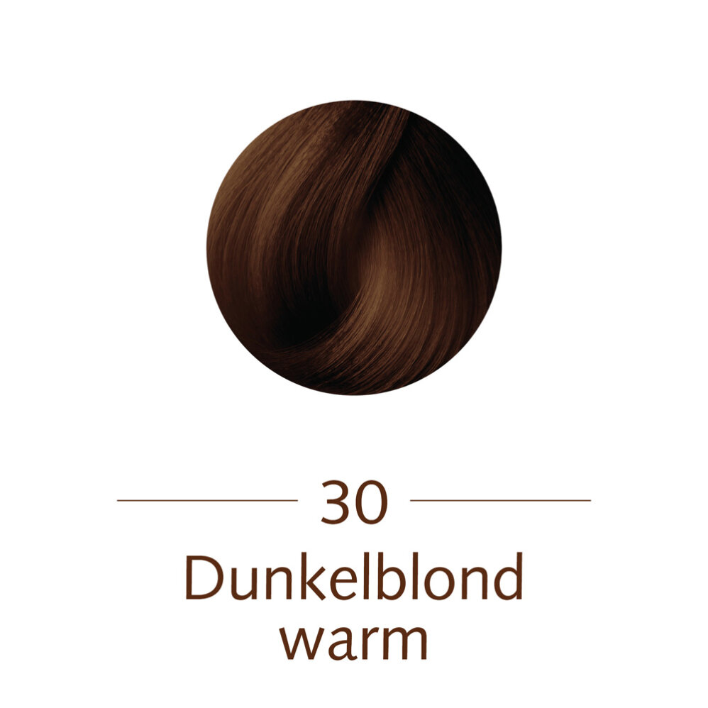 Farbpaste (Tube) 30 Dunkelblond Warm:, Aqua, Cetearyl Alcohol, Ethanolamine, Polysorbate 80, Ceteareth-30, Sodium Lauryl Sulfate, Isopropyl Stearate, Propylene Glycol, Tetrasodium EDTA, Parfum, Ascorbic Acid, Sodium Hydrosulfite, Panicum Miliaceum Extract, Biotin, Calcium Pantothenate, Olea Europaea Leaf Extract, Vitis Vinifera Leaf Extract, Betula Alba Bark Extract, Urtica Dioica Leaf/Stem Juice, Limonene, Benzyl Alcohol, Benzyl Salicylate, Amyl Cinnamal, p-Phenylenediamine, 2-Methylresorcinol, p-Aminophenol, m-Aminophenol, 4-Chlororesorcinol Fixiermittel (Flasche):, Aqua, Hydrogen Peroxide, Stearyl Alcohol, Cetearyl Ethylhexanoate, Ceteareth-50, Phosphoric Acid, Phenoxyethanol, Tetrasodium EDTA, Sodium Gluceptate, Disodium Pyrophosphate Revitalisierungsbalsam:, Aqua, Cetearyl Alcohol, Cetrimonium Chloride, Panicum Miliaceum Extract, Laurdimonium Hydroxypropyl Hydrolyzed Wheat Protein, Isopropyl Stearate, Calcium Pantothenate, Biotin, Citric Acid, Parfum, Phenoxyethanol, Benzyl Alcohol, Isoeugenol, Geraniol, Limonene, Benzyl Salicylate, Eugenol, Hydroxycitronellal, Linalool, Alpha-Isomethyl Ionone