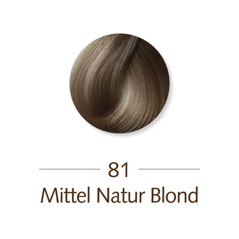 Farbpaste (Tube) 81 Mittelnaturblond:, Aqua, Cetearyl Alcohol, Ethanolamine, Polysorbate 80, Ceteareth-30, Sodium Lauryl Sulfate, Isopropyl Stearate, Propylene Glycol, Tetrasodium EDTA, Ascorbic Acid, Sodium Hydrosulfite, Panicum Miliaceum Extract, Biotin, Calcium Pantothenate, Olea Europaea Leaf Extract, Vitis Vinifera Leaf Extract, Betula Alba Bark Extract, Urtica Dioica Leaf/Stem Juice, p-Aminophenol, 4-Chlororesorcinol, m-Aminophenol, 2-Methylresorcinol, Toluene-2,5-Diamine Sulfate Fixiermittel (Flasche):, Aqua, Hydrogen Peroxide, Stearyl Alcohol, Cetearyl Ethylhexanoate, Ceteareth-50, Phosphoric Acid, Phenoxyethanol, Tetrasodium EDTA, Sodium Gluceptate, Disodium Pyrophosphate Revitalisierungsbalsam:, Aqua, Cetearyl Alcohol, Cetrimonium Chloride, Panicum Miliaceum Extract, Laurdimonium Hydroxypropyl Hydrolyzed Wheat Protein, Isopropyl Stearate, Calcium Pantothenate, Biotin, Citric Acid, Parfum, Phenoxyethanol, Benzyl Alcohol, Isoeugenol, Geraniol, Limonene, Benzyl Salicylate, Eugenol, Hydroxycitronellal, Linalool, Alpha-Isomethyl Ionone