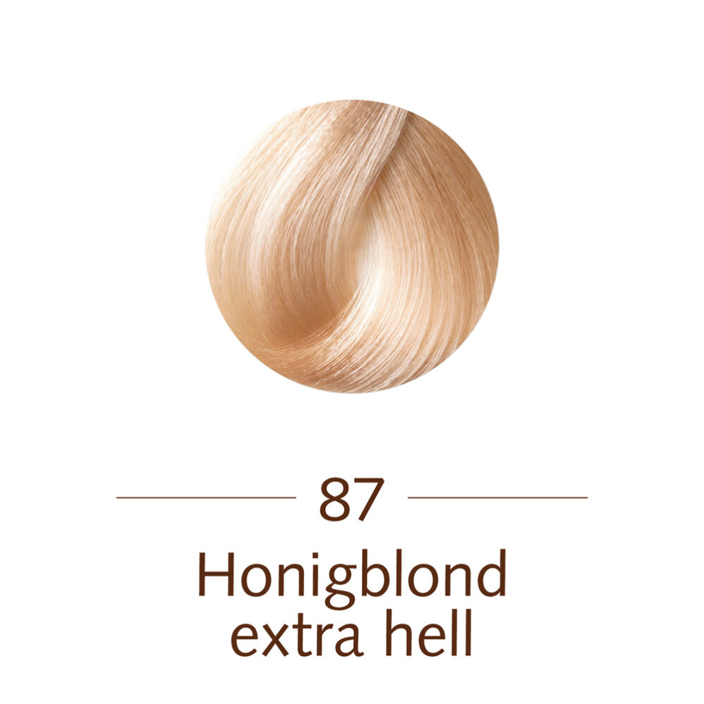 Farbpaste (Tube) 87 Honigblond Extra Hell:, Aqua, Cetearyl Alcohol, Ethanolamine, Polysorbate 80, Ceteareth-30, Sodium Lauryl Sulfate, Isopropyl Stearate, Propylene Glycol, Tetrasodium EDTA, Parfum, Ascorbic Acid, Sodium Hydrosulfite, Panicum Miliaceum Extract, Biotin, Calcium Pantothenate, Olea Europaea Leaf Extract, Vitis Vinifera Leaf Extract, Betula Alba Bark Extract, Urtica Dioica Leaf/Stem Juice, Limonene, Linalool, p-Aminophenol, 4-Amino-2-Hydroxytoluene Fixiermittel (Flasche):, Aqua, Hydrogen Peroxide, Stearyl Alcohol, Cetearyl Ethylhexanoate, Ceteareth-50, Phosphoric Acid, Phenoxyethanol, Tetrasodium EDTA, Sodium Gluceptate, Disodium Pyrophosphate Revitalisierungsbalsam:, Aqua, Cetearyl Alcohol, Cetrimonium Chloride, Panicum Miliaceum Extract, Laurdimonium Hydroxypropyl Hydrolyzed Wheat Protein, Isopropyl Stearate, Calcium Pantothenate, Biotin, Citric Acid, Parfum, Phenoxyethanol, Benzyl Alcohol, Isoeugenol, Geraniol, Limonene, Benzyl Salicylate, Eugenol, Hydroxycitronellal, Linalool, Alpha-Isomethyl Ionone