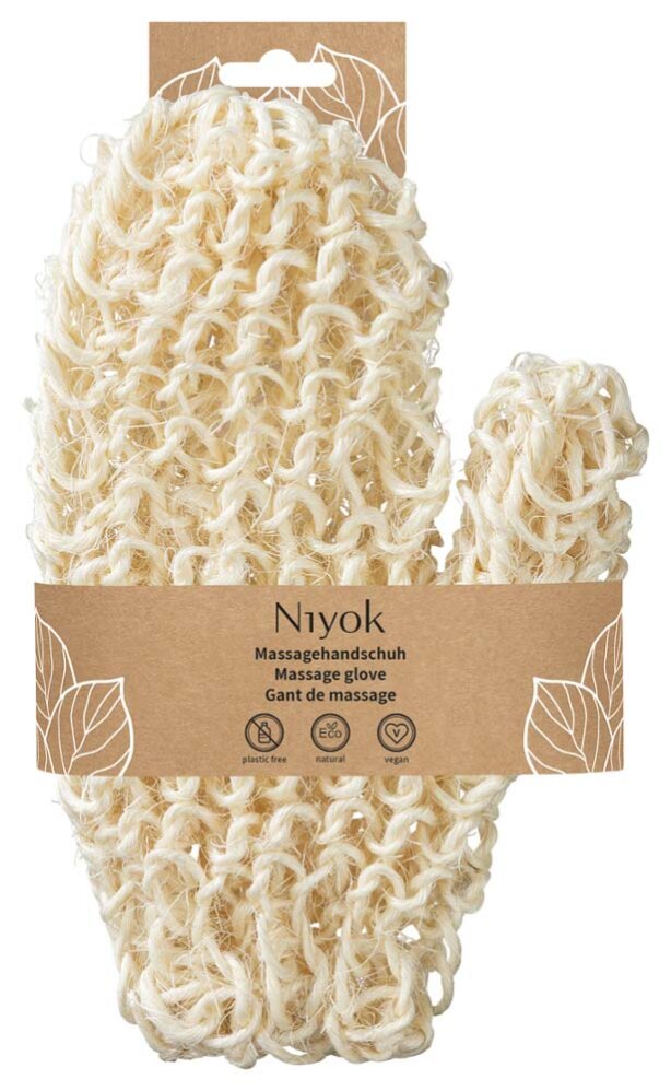 Массажная перчатка Niyok, изготовленная из вязаного сизаля, мягко стимулирует кожу и улучшает кровообращение. Благодаря мягкому отшелушивающему эффекту удаляются отмершие клетки кожи.