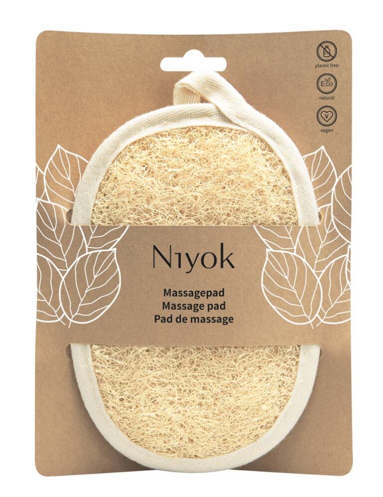 Массажный коврик Niyok, изготовленный из люфы и хлопка, способствует регенерации кожи. Луфа удаляет отмершие клетки кожи и стимулирует кровообращение, а хлопок мягко удаляет остатки косметических средств.