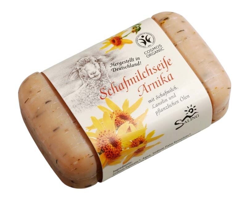 Sodium Palmate, Aqua, Sodium Palm Kernelate, Glycerin, Sheep Milk Powder, Lanolin, Sodium Chloride, Arnica Montana Flower, Parfum, Limonene, Linalool, Tetrasodium Glutamate Diacetate, Citric Acid, Arnica Montana Flower Extract, CI 77491, CI 77492 Hergestellt mit Bio-Inhaltsstoffen (Made using organic ingredients) Inhaltsstoffe aus kontrolliert biologischer Aufzucht (ingredients from organic farming)82 % der gesamten Inhaltsstoffe sind aus kontrolliert biologischem Anbau (of the total ingredients are from organic farming)99 % der gesamten Inhaltsstoffe sind natürlichen Ursprungs (of the total ingredients are from natural origin)