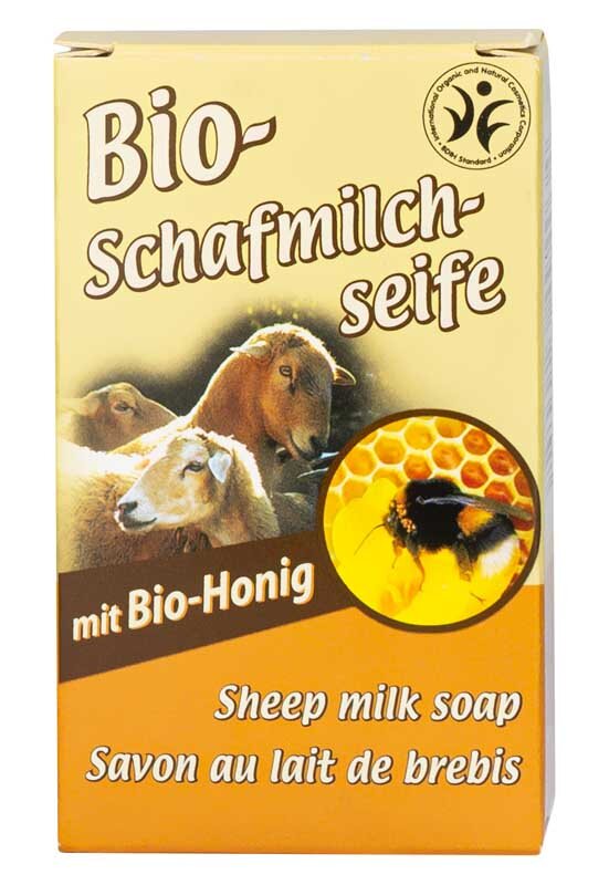 Sodium Palmate (Palmöl), Sodium Cocoate (Kokosöl), Aqua (Wasser), Sodium Olivate (Olivenöl), Glycerin (Glyzerin), Mel kba (Honig kba), Lactis Ovis kbT (Schafsmilch kbT), Lanolin Cera (Lanolin), Citrus Aurantium Extract (ätherisches Orangenöl), Rhizoma Curcumae kba (Kurkumawurzel kba), Sodium Thiosulfate (Natriumthiosulfat), Limonene. Rohstoffe aus kontrolliert biologischem Anbau
