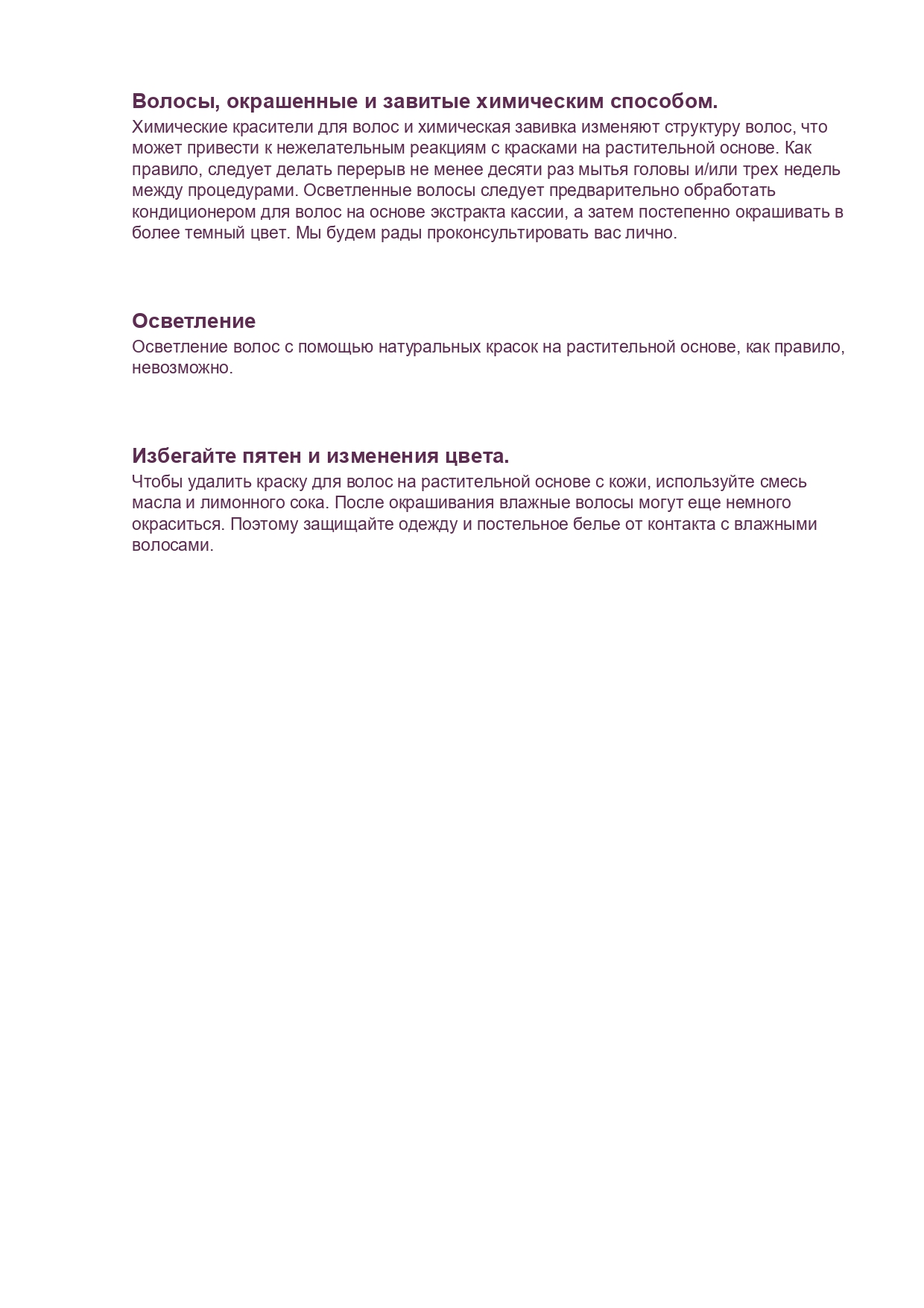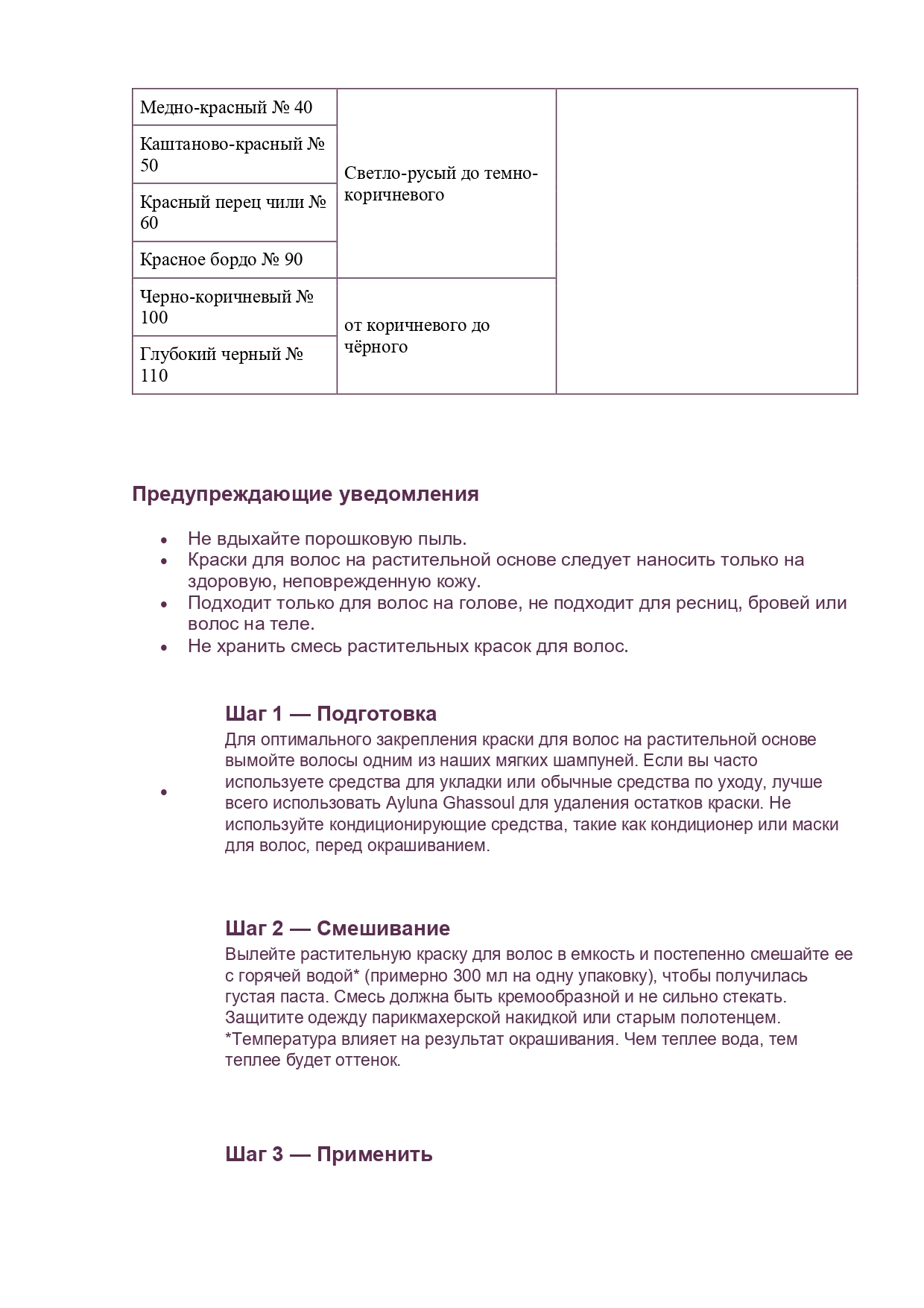 Если Вы привыкли интенсивно ухаживать за своими волосами с использованием обычных средств для укладки и т.д., то чтобы подготовить волосы к окрашиванию натуральными красками, настоятельно рекомендуется использовать натуральные шампуни Аилуна и/или Порошок-маску очищающую для тела и волос Гассул Аилуна. Перед окрашиванием не наносите на волосы никакие средства ухода, в том числе ополаскиватели и бальзамы.