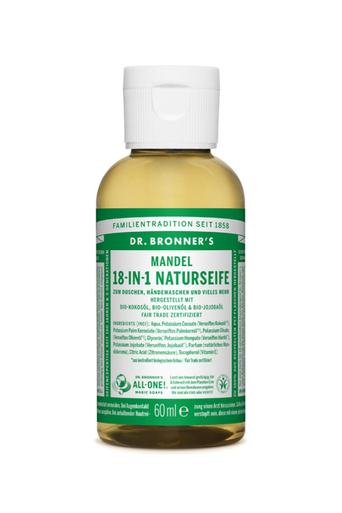 Aqua, Potassium Cocoate (Verseiftes Kokosöl°), Potassium Palm Kernelate (Verseiftes Palmkernöl°), Potassium Olivate (Verseiftes Olivenöl°), Glycerin, Potassium Hempate (Verseiftes Hanföl), Potassium Jojobate (Verseiftes Jojobaöl), Parfum (natürliches Mandelaroma), Citric Acid (Zitronensäure), Tocopherol (Vitamin E) ° Fair Trade zertifiziert aus kontrolliert biologischem Anbau aus natürlichen ätherischen Ölen
