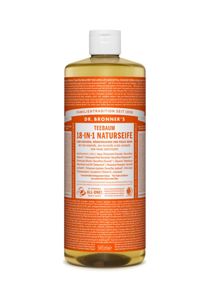 Aqua, Potassium Cocoate (Verseiftes Kokosöl°), Potassium Palm Kernelate (Verseiftes Palmkernöl°), Potassium Olivate (Verseiftes Olivenöl°), Glycerin, Melaleuca Alternifolia Leaf Oil (Teebaumöl), Potassium Hempate (Verseiftes Hanföl), Potassium Jojobate (Verseiftes Jojobaöl), Citric Acid (Zitronensäure), Tocopherol (Vitamin E), Limonene ° Fair Trade zertifiziert aus kontrolliert biologischem Anbau aus natürlichen ätherischen Ölen