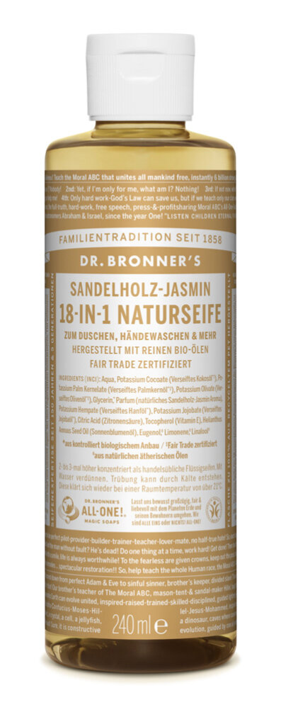 Aqua, Potassium Cocoate (Verseiftes Kokosöl), Potassium Palm Kernelate (Verseiftes Palmkernöl), Potassium Olivate (Verseiftes Olivenöl), Glycerin, Parfum (natürliches Sandelholz-Jasmin Aroma), Potassium Hempate (Verseiftes Hanföl), Potassium Jojobate (Verseiftes Jojobaöl), Citric Acid (Zitronensäure), Tocopherol (Vitamin E), Helianthus Annuus Seed Oil (Sonnenblumenöl), Eugenol, Limonene, Linalool Aus kontrolliert biologischem Anbau Fair Trade zertifiziert Aus natürlichen ätherischen Ölen