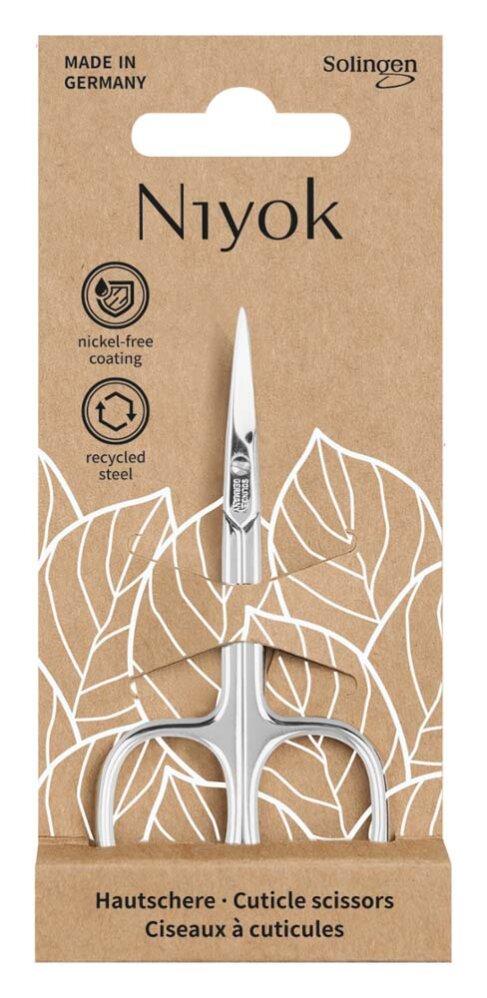 Лезвия ножниц для кутикулы Niyok с плавно изогнутыми краями, заточенные вручную, идеально подходят для удаления кутикулы. Изготовлены в Золингене, Германия, с покрытием без никеля. Содержание переработанной стали > 80%