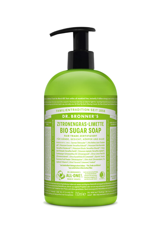 Sucrose (Rohrzucker°), Vitis Vinifera Juice (Traubensaft), Potassium Cocoate (Verseiftes Kokosöl°), Potassium Palm Kernelate (Verseiftes Palmkernöl°), Potassium Olivate (Verseiftes Olivenöl°), Potassium Hempate (Verseiftes Hanföl), Potassium Jojobate (Verseiftes Jojobaöl), Cymbopogon Schoenanthus Oil (Zitronengrasöl), Citrus Aurantifolia Oil (Limonenöl), Glycerin, Acacia Concinna Fruit Powder (Shikakaipulver), Citric Acid (Zitronensäure), Tocopherol (Vitamin E), Citral, Geraniol, Limonene, Linalool ° Fair Trade zertifiziert aus kontrolliert biologischem Anbau aus natürlichen ätherischen Ölen