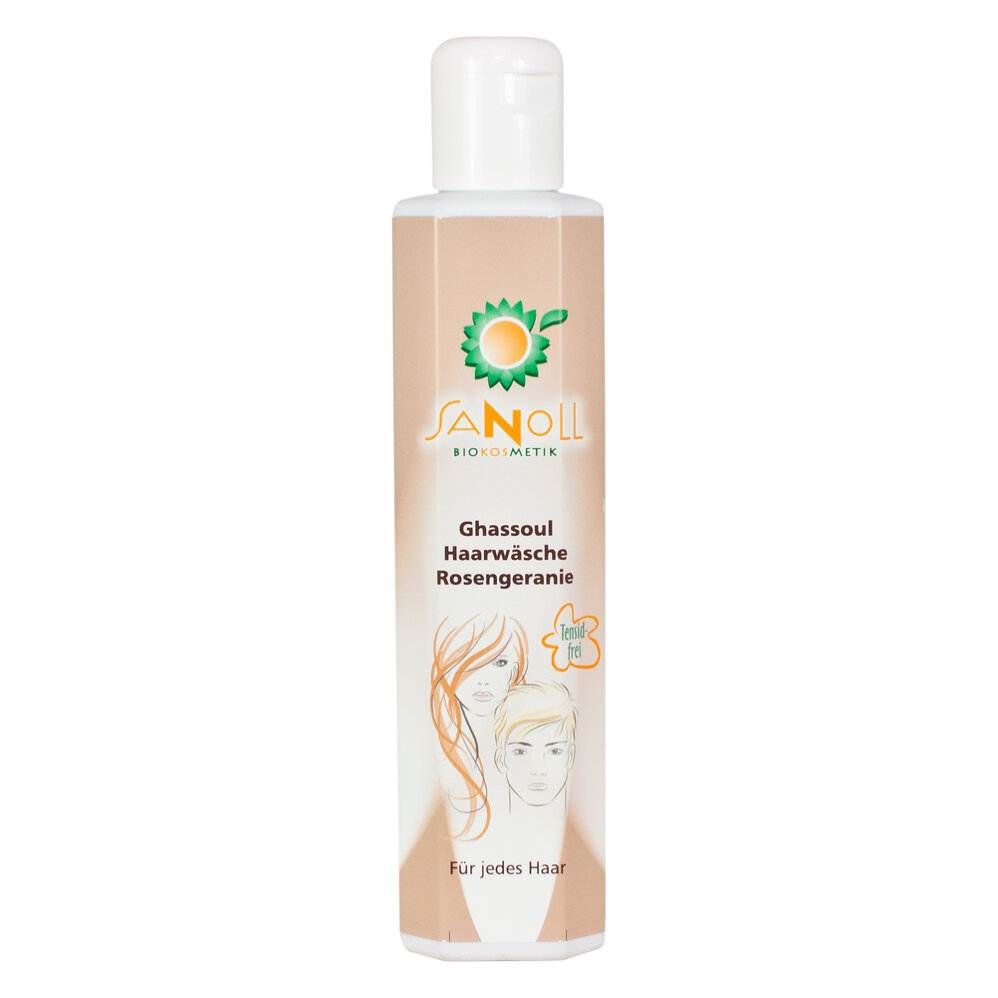 Шампунь для волос Sanoll Ghassoul с ароматом розы и герани подходит для всех типов волос и может использоваться в душе. Натуральная альтернатива шампуню, полностью без поверхностно-активных веществ, Ghassoul не пенится! Хорошо встряхните! Мелкие частицы глины естественным образом впитывают излишки кожного сала и загрязнения.