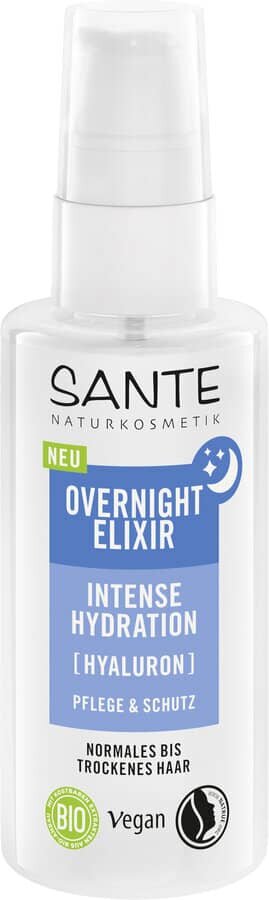 НОЧНОЙ ЭЛИКСИР ИНТЕНСИВНОГО УВЛАЖНЕНИЯ SANTE обеспечивает интенсивное увлажнение нормальных и сухих волос в течение ночи. Высокоэффективная формула с: - Гиалуроновой кислотой: обеспечивает интенсивное увлажнение и длительную защиту от сухости, не утяжеляя волосы; - Алоэ вера: эффективно увлажняет и укрепляет волосы.