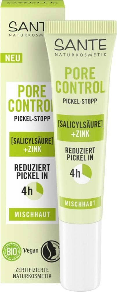 Средство SANTE Pore Control Blemish Stop обеспечивает целенаправленное и немедленное облегчение симптомов прыщей и пятен, обладает антибактериальным эффектом, снимает воспаление, а также уменьшает покраснение и раздражение.