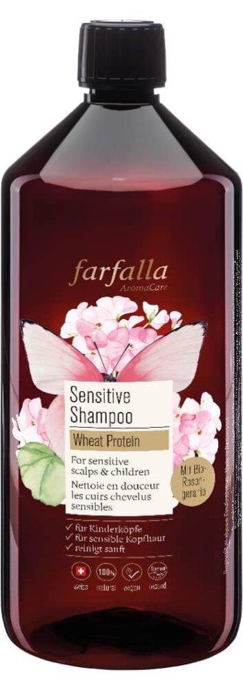 С органической розовой геранью. Особенно мягкое, полностью натуральное средство для мытья волос, идеально подходящее для чувствительной кожи головы, благодаря своей щадящей формуле с протеинами пшеницы и успокаивающей розовой водой.