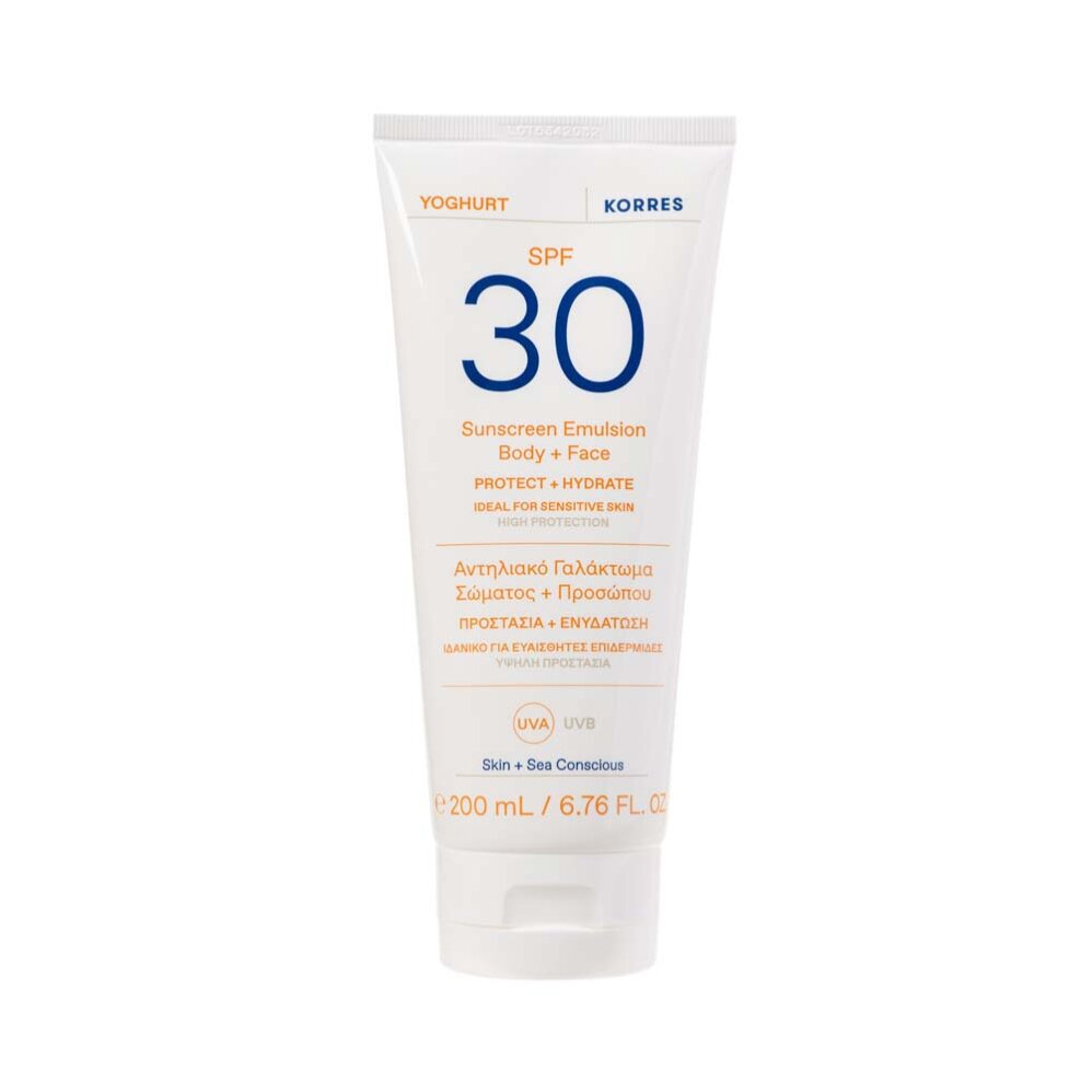 Солнцезащитная эмульсия KORRES на основе йогурта для тела и лица, SPF 30, 200 мл
