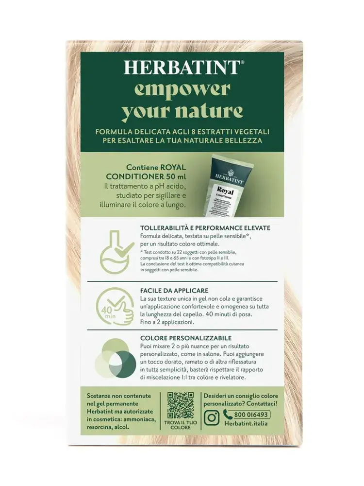 мягкая формула, протестированная на чувствительной коже, для оптимального результата окрашивания. Веганский продукт. С 8 растительными экстрактами для усиления вашей естественной красоты. Мягкая формула Herbatint позволяет вам осветлить ваш естественный оттенок до 2 уровней (только на натуральных, необработанных волосах).
